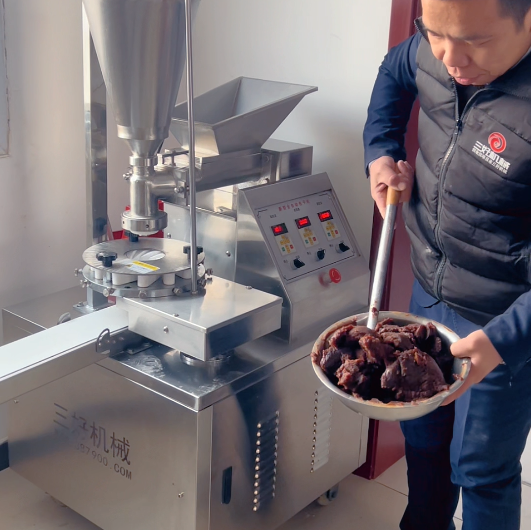 和好面以后,直接利用三好包子机加工成型,这时不要忘记把豆沙加入到料口,如果老铁使用带花纹的成型块,会出现有褶麻团,如果想要消除褶纹,这时就需要更换刀头,不然这种现象无法排出,在面团和馅料分别加入到指定料斗以后,通过三好配置的数控系统进行调节大小,麻团的馅料一遍比较少,这时切记馅斗的供应速度调节。